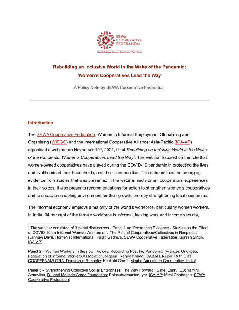 The SEWA Cooperative Federation, Women in Informal Employment Globalising and Organising (WIEGO) and the International Cooperative Alliance: Asia-Pacific (ICA-AP) organised a webinar on November 19th, 2021, titled Rebuilding an Inclusive World in the Wake 1 of the Pandemic: Women’s Cooperatives Lead the Way .