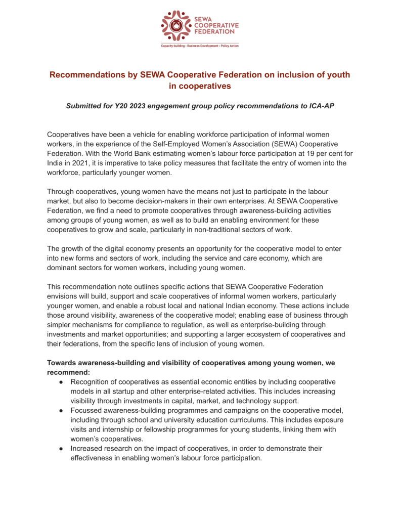 Cooperatives have been a vehicle for enabling workforce participation of informal women workers, in the experience of the Self-Employed Women’s Association (SEWA) Cooperative Federation.