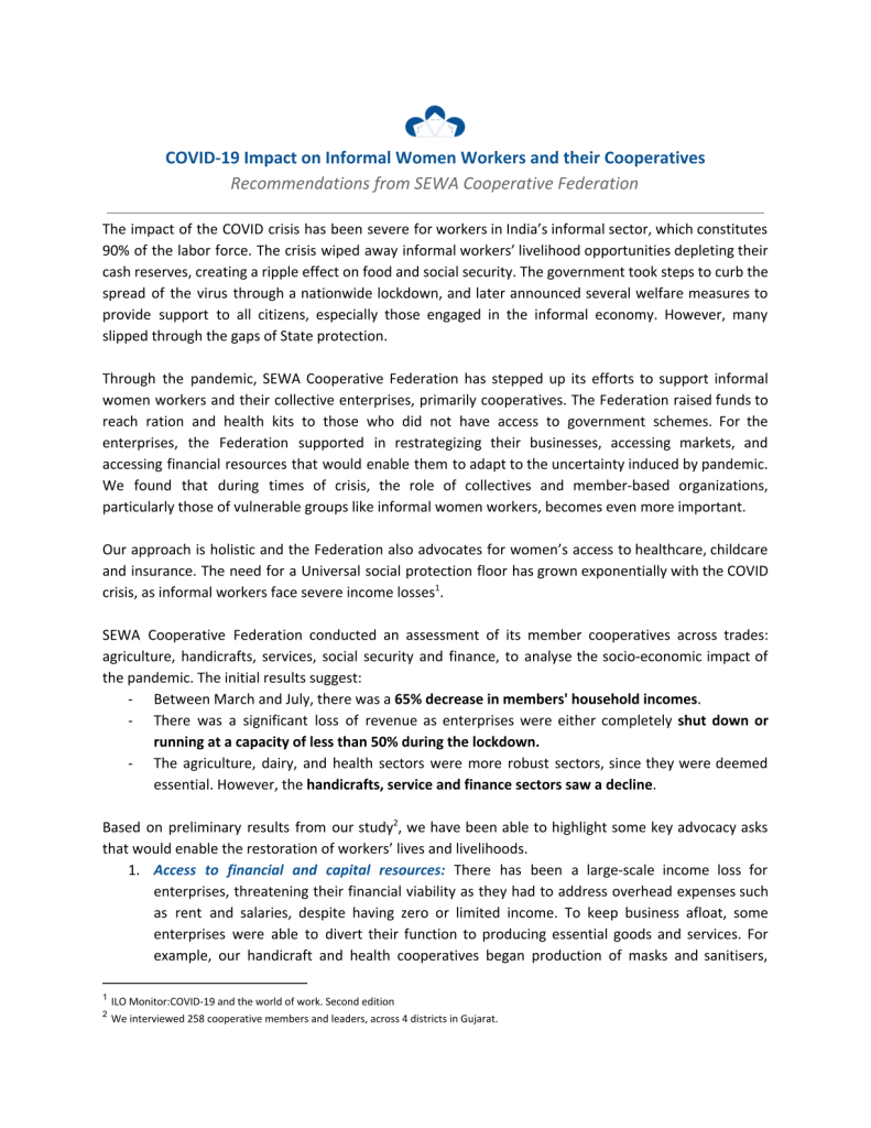 Recommendations COVID-19 Impact on Informal Women Workers and their Cooperatives
